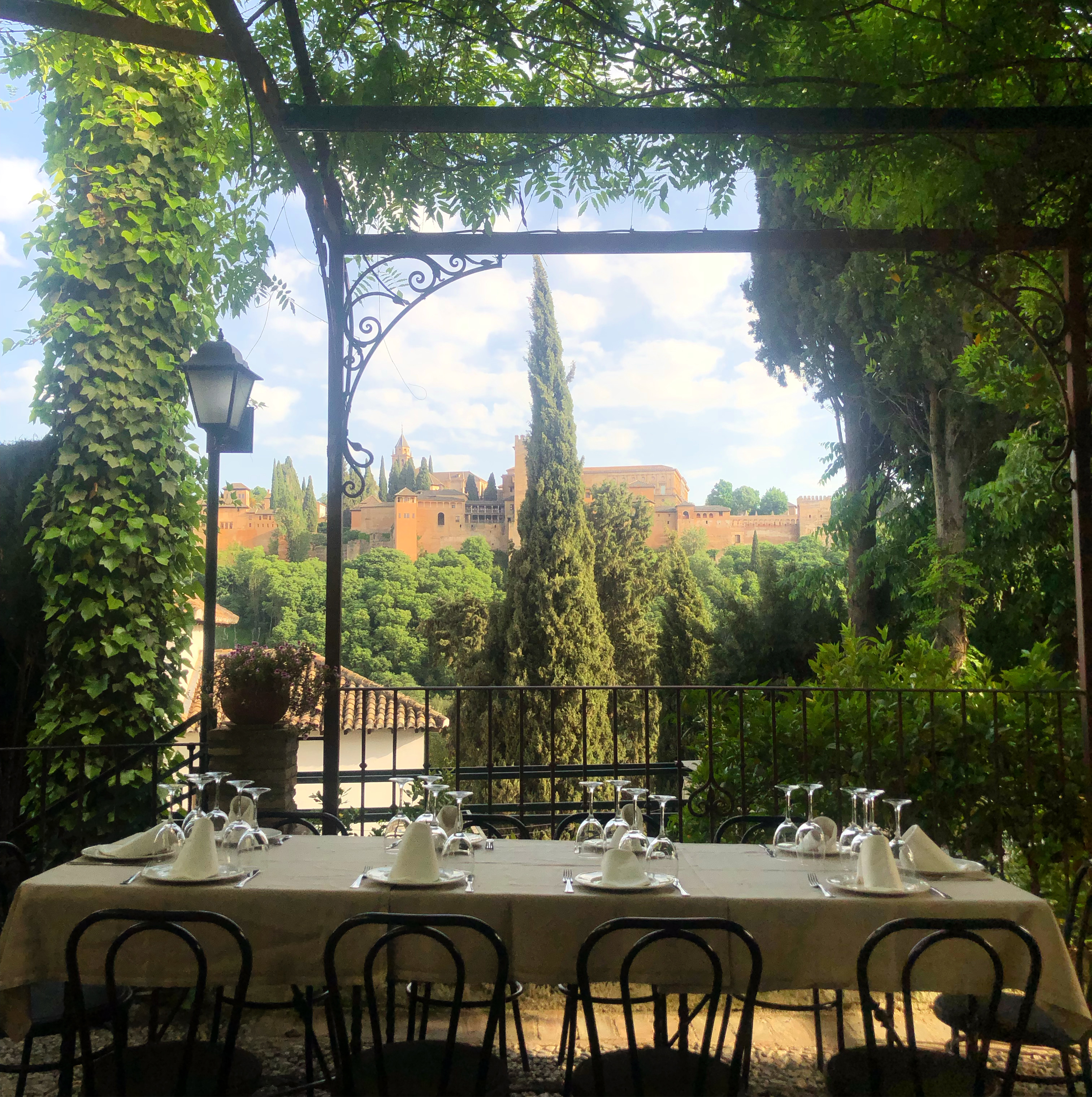 En mis recomendaciones están el Mirador de Moraima que pueden ver la foto aquí debajo de su patio con unas vistas espectaculares a la Alhambra en especifico los palacios Nazaríes , esta localizado en una casa antigua tipo morisco del barrio del Albayzín. En el restaurante sirven comida tipo granadina, mi preferida es el remojón granadino una ensalada con rodajas de naranja, bacalao, olivas, huevo duro, olivas negras y en algunos casos se añaden patatas hervidas. Todo lo que pedimos nos encantó, y además tienen vino ecológico de su propia cosecha.